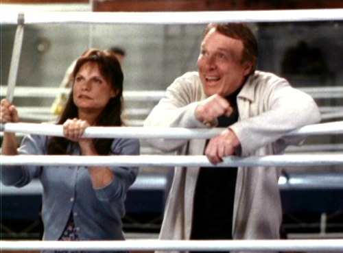 Look for some interesting cameos. (1) Remember Mary Hartman's husband from three decades ago? The character was played by Greg Mullavey, and he's in this movie as the boxer's crusty old trainer! I recognized his voice, but couldn't figure out who he was until I looked it up. I haven't seen him in years, maybe decades. His appearance is completely different now. (2) Kay Lenz is trying to mount a movie comeback, and she has a small role in this film as the boxer's mom. (MILF!!) Mullavey and Lenz are shown below. |