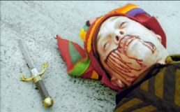 It ain't over till it's over. The evil dwarf is now on a boat with his lady vampire from the opening scene. She's tied to the mast, and the sun is coming up, so she fries to a crisp, and the evil dwarf, desperately in love with her and inconsolable over her loss, kills himself with his tiny little evil knife. Alas, poor Lumpy. I knew him, Horatio, If you look closely at the picture to the right, you'll see it is (1) bloodless (2) a butter knife But what's this? The scene shifts again. |