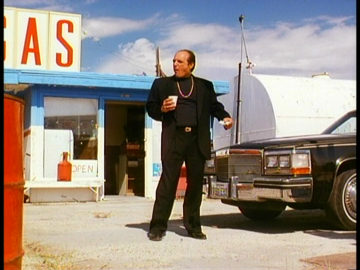 I just have to say that it really takes a dedicated mobster to wear a black suit with a black shirt and gold chains in the desert. (Right. Evil Dude himself.)
