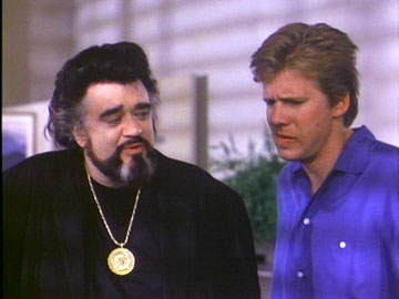 Eating Raoul is considered a cult classic, and if Bartel had written nothing else, it would have been enough to confer on him the status of "minor B-movie legend," and that position is firmly cemented by the others listed above. Bartel's "sort by ratings" page at IMDb actually turns up four writing credits, not three. There are the three above which he directed himself, and this film, Mortuary Academy, which was his lowest-rated writing effort and the only one directed by somebody else (then-rookie Michael Schroeder). It's just not a good movie, far below Bartel's usual caliber. It's a comedy in which everyone is trying desperately to be zany instead of letting the material work for them. Although, considering the material, I can see why they were pushing. The story centers on two brothers named Grimm (the brothers Grimm - nudge, nudge) who find themselves heirs to a mortuary and an academy to train morticians. Their late uncle's will makes the unusual inheritance contingent on their having passed the program at the academy. They boys find this rather challenging since the corrupt man currently running the academy (played by Paul Bartel himself) has no intention of letting the boys take over, and he can prevent it merely by failing them. When exam time arrives, the other students get questions like, "What do you call the place with tombstones where dead people are buried?", while our heroes have to answer long, impossibly technical trick questions. That's pretty much the highlight of the comedy, and is certainly the high point of the movie's tastefulness. I did smile during one scene when gangs from two different mortuaries had a rumble over body parts at the scene of a grisly accident, but the rest of the jokes seem to center on necrophilia. For example, the head of the academy falls in love with the corpse of a cheerleader, so the zany students hot-wire her genitals to trap the professor inside, and thus blackmail him into giving them a passing grade. Actually, now that I type that up, it sounds like a twisted enough concept to be darkly funny in the proper hands, but it just didn't work here. The film ends up being a mixture of the usual juvenile Police Academy humor and Bartel's more daring conceptual stuff, and the filmmakers never do find a way to combine those effectively. It is possible that the premise might have worked if the actors had taken it seriously and played it straight, letting the bizarre material work, but many of the film's problems derive from a broad performing style, in which every character is allowed to deliver lines in the "look at me, I'm making funny exaggerated faces" style of Vince McMahon in a wrestling skit, or Caesar Romero playing the Joker on Batman. Bartel himself was especially hammy, and one of the minor characters was actually played by Caesar Romero in full Joker mode ... ... and he was one of the more subtle characters. Some of the film's other actors include B-movie veterans Christopher Atkins, Anthony James, Vance Colvig, and Tracey Walter. Some of the more unusual casting included Wolfman Jack (pictured below left with Perry Lang), and the guy who played Marmalard in Animal House (below right, with Lang again), who was still playing Marmalard, right down to the clothing. I think he saved his wardrobe from Animal House. |