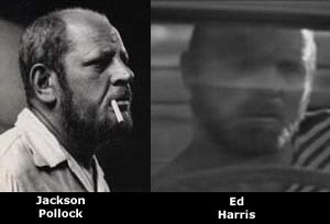 play the artist in the later stages of his life. Harris is also brilliant at recreating the various Pollock techniques. The camera shows him painting with both brush strokes and the drip method, and you would swear that he was creating the actual Pollock paintings. I assume Harris isn't a great painter, so he must have done some great acting and a lot of homework. The film is focused on the artistic process, and the details of Pollock's relationships with people are much less important than his relationship with his canvases. Although Pollock was a complex and protean man, his dominant behavior pattern was that of a loner and an introvert, who reached inside his own subconscious for inspiration. In the film, Pollock stares at a canvas for what seems like days, then bursts in action like Johnny Storm yelling "flame on!", and runs around the canvas like a man possessed, casting great gobs of color here and there with a logic comprehensible only to himself. He didn't speak much to outsiders. His wife Lee acted as his surrogate mother, nanny, secretary, apologist and muse. Pollock was an alcoholic who really needed Lee to help him with life's details as well as to keep him focused on his work. Unfortunately, an artistic process as internalized, as devoid of people and places as Pollock's was, doesn't always make for great entertainment. Whether you like the film or not depends on what you would like the film to be.