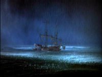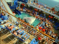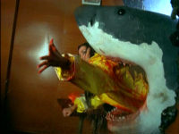 | Here are four examples of the very convincing special effects. (L) A shark breaks through the hull of a ship and chows down on a woman. Note that no water enters the ship as part of this process. The shark itself also seems rather dry. Maybe it's a land shark? "Candygram". (LC) Worst miniatures ever. (RC) Worst CGI montage ever. The shark in the pool is partially transparent. (R) The shark's body double is obviously an Orca, not a shark. | |||||