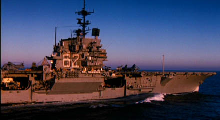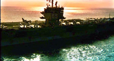Submerged could have been entered in The Simpsons' famous Stock Footage Film Festival. Every time they needed an establishing shot of the exterior of the mighty USS Clinton, the director showed stock newsreel footage - and each time it was a different carrier! Sometimes the changes were pretty obvious. First we're looking at a conventional Forrestal-class carrier with a big number 62 painted on it. (Naval records show that to be the now-decommissioned Independence, below left.) Then we're looking at a larger nuclear carrier with a big ol' 65 painted on it. (That would be the Enterprise, below right.) Even a landlubber like me can see that the fokkin' jumbo-ass numbers are different! |