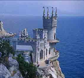 autonomous, mostly Russian-speaking republic within Ukraine.) Crimea has some spectacular vistas, like the famous Swallow's Nest castle (right) which was used for a couple of minor scenes in this film. Southern Crimea even has palm trees. Best of all, many parts of the landscape have never been seen by Western eyes. Some portions of Southern Crimea are even unfamiliar to long-term residents of the Soviet Union, because the entire city of Sevastopol was closed for many years because of its importance to Russian naval strategies. Although IMDb dates this film in 2000, Termination Man was actually made in 1997, only about a year after Sevastopol was finally open to outsiders. |