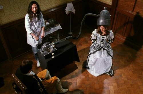 I didn't make that up. There it is to the left. When the timer expires, the hamster is allowed to crawl through the tube into the hair dryer. Honest. My money says the old-fashioned clothing just happened to be handy and free, since it seemed unrelated to the plot. But if they had to pay for those outfits, the film obviously blew its entire costume budget on the agents' clothing, because the evil scientist is wearing jeans and Nikes! But very evil jeans and Nikes. |
