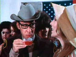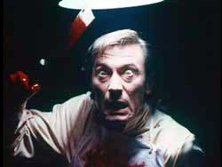 Harvey's acting in the film is predictably intense and haunted and joyless (right), as you might expect from a man playing a tragic cannibal while he himself was dying of cancer, but that was just typical grade-B stuff, and would not serve to make the film especially memorable. His direction is what makes the film really shine with incompetence. The musical score, for example, is non-stop elevator music, capped off by a Lou Rawls love ballad which is crooned in the performer's characteristically mellow style over the opening and closing credits. If that weren't enough to destroy the tone of a cannibal film, there's also the standard comic relief that can only be provided by a wacky incompetent deputy doing a Woody Allen impersonation (left)! |